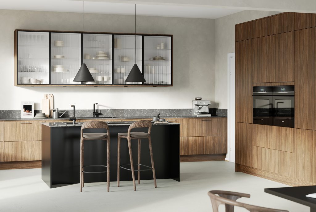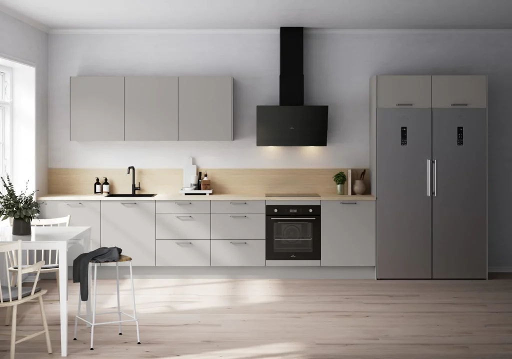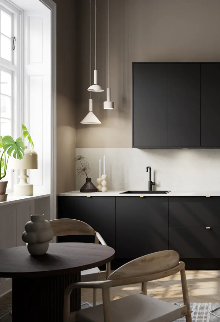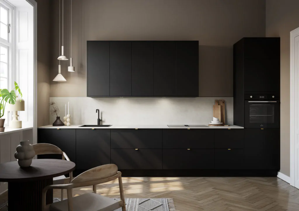 Tänu tagasihoidlikule stiilile ning heledale töötasapinnale ja pritsmeseinale on see mustades toonides köök ühtaegu moodne ja ruumikas. Siin on kõik, mida kogenud kodukokk vajab – suur integreeritud õhupuhastiga pliit, mugaval kõrgusel ahi ja stiilne töövalgustus. Hea nii kehale kui ka vaimule.