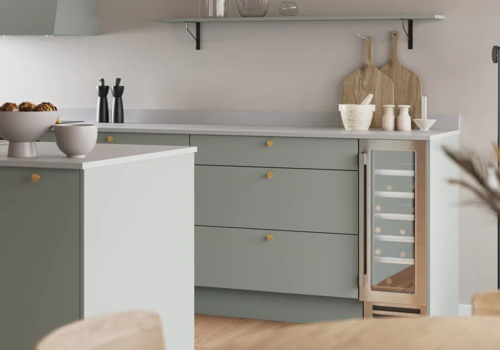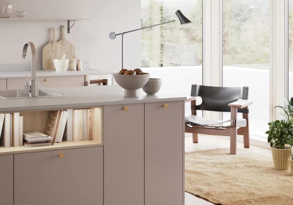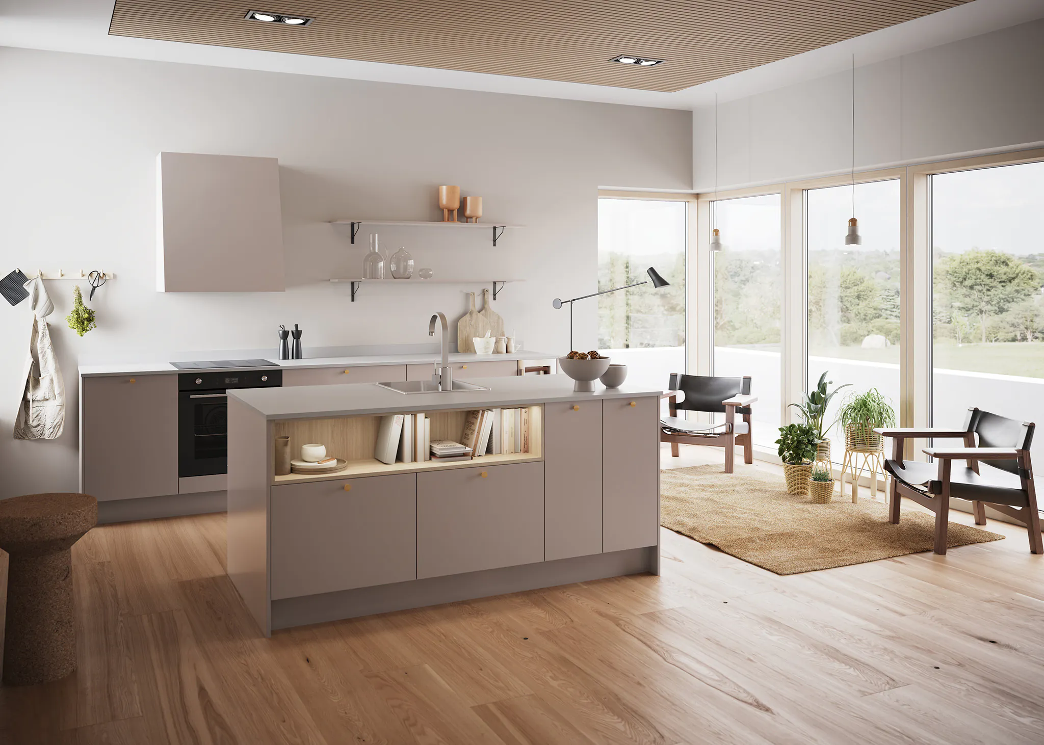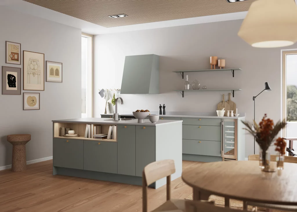 Sellises avatud köögis on rohkesti hoiuruumi ja töötasapindu ning köögisaarel on ka sisseehitatud ja valgustatud riiulid. Tagasihoidlik matt värv annab köögile moodsa ilme.